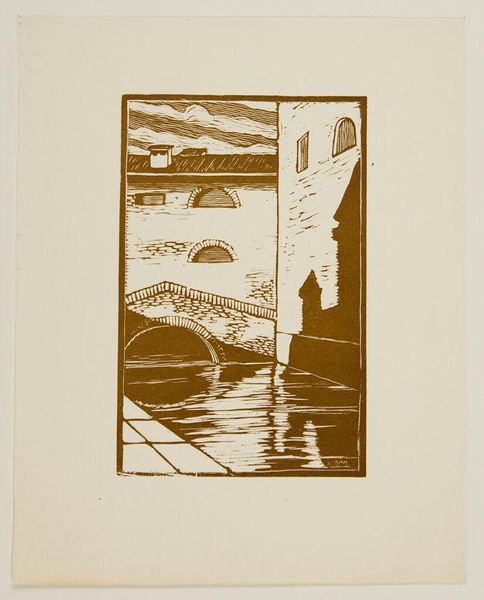 Editor: This is Erich Heckel’s "Curving Canal," a woodcut from 1915. I'm struck by how the sharp, angular lines create this unsettling atmosphere, even in a landscape. What symbols do you see playing out here? Curator: Notice how the black sun looms—a disc of obscured light, almost oppressive. Does it feel like the promise of dawn, or the dread of nightfall made permanent? It speaks to the era, wouldn't you say? The rising anxieties and social turbulence reflected in distorted reality, the simplification into the starkest of contrasts. The "canal" itself, the watercourse as symbolic artery—what flows through this city, would you say, lifeblood or poison? Editor: Poison, maybe? Those dark buildings crammed together feel so claustrophobic. And what about the two little boats? Are they hope, or just… trapped? Curator: Observe how the "hope" takes the form of a child’s simple drawing. These shapes carry emotional weight despite their simplification. Consider: Is this vulnerability, naiveté, and potential for being overwhelmed significant? Editor: Definitely! So it’s not just a picture of a canal; it’s about all of this collective unease being concentrated into one image. I guess I thought landscapes were just supposed to be pretty. Curator: Indeed! German Expressionism offers more than just the picturesque. What happens when memory and premonition collapse into a single frame? Landscapes can be fever dreams. We remember, through such stark visions, that places hold history. And history, whether promise or omen, permeates a people. Editor: It's much more than just a cityscape, isn't it? It is an omen, a dark reflection. Thanks for pointing that out! Curator: The pleasure's all mine. I learned a thing or two, myself!