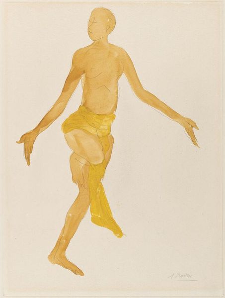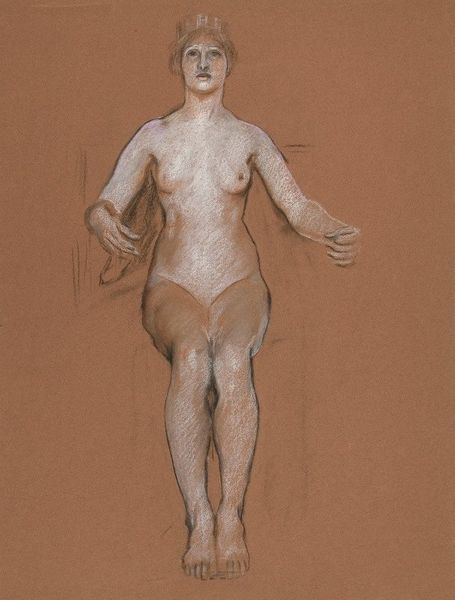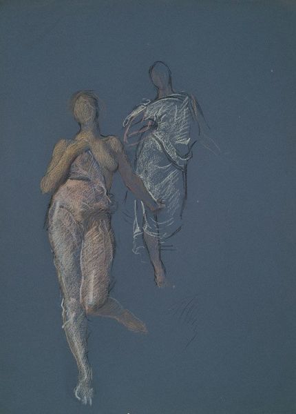 Editor: This is Euan Uglow's painting, "Zagi," currently residing at the Tate. I find it intriguing how the artist chose to render the figure with such geometric precision against that stark black background. What compositional choices stand out to you? Curator: Notice the deliberate rendering of the figure. The artist employs a calculated, almost mathematical approach to form. Uglow's interest lies in the abstract structure of the body rather than realistic depiction. How does this structured approach affect your interpretation? Editor: It almost feels sculptural. The planes of color create a sense of volume, but also detachment. I am struck by the contrast between the curves of the figure and the straight lines of the composition. Curator: Precisely. The tension between the organic form and the geometric construction creates a dynamic visual experience. The materiality and geometry are prioritized over narrative, challenging conventional figurative representation. Editor: That’s fascinating. I see the figure in a new light now. Curator: Indeed, Uglow's work prompts us to reconsider how we perceive and interpret the human form through the lens of pure visual structure.