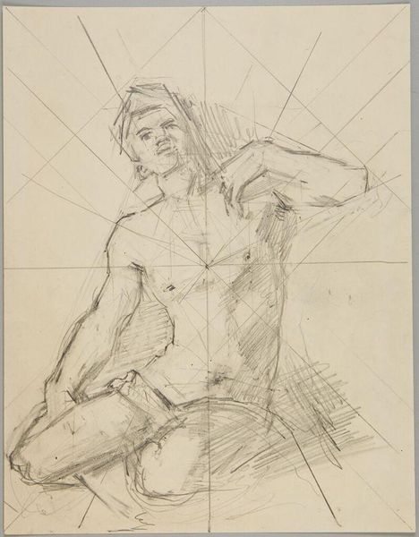 Editor: This is Denman Waldo Ross's "David Standing on One Foot," a pencil drawing. It's fascinating how he's mapped out the figure with geometric lines. What do you make of this intersection of the human form and rigid structure? Curator: It's tempting to see this as simply an academic exercise, but the very act of imposing a grid, a system of control, onto the male nude, an object historically charged with power and idealization, is significant. Editor: How so? Curator: Ross creates a tension. He’s both celebrating and dissecting the body, asking us to consider the social frameworks that shape our perceptions of beauty, strength, and even masculinity itself. Does the grid confine, or does it reveal underlying truths? Editor: I hadn't thought of it that way. It's more complex than I initially realized. Curator: Precisely. It speaks to how we are all, in a sense, constructed beings.
