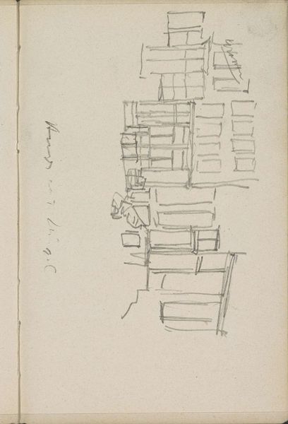 Editor: Here we have "Gezicht op gebouwen aan het Damrak te Amsterdam ter hoogte van de Oudebrugsteeg," a pencil drawing from around 1900-1901 by George Hendrik Breitner, currently held in the Rijksmuseum. The muted tones give the buildings a sort of ethereal, fleeting presence, almost like a memory fading away. What do you make of it? Curator: The seemingly simple sketch reveals layers when considered as part of Breitner’s artistic approach. Note the rapid, almost shorthand notation. The strokes capture more than just architectural details. The visible page edges and faint handwritten notes suggest this was not intended as a finished piece but part of a sketchbook—a receptacle for urban life's transient moments. Doesn't this suggest something about the changing landscape of Amsterdam and how we choose to remember the recent past? Editor: I see what you mean. The visible edges really place the sketch in time, not just of the buildings but also as part of the artist's everyday experience. Curator: Exactly! The building itself isn't necessarily unique but by being observed, perceived and captured by the artist, these fleeting moments become a symbolic representation of a city transforming. Do you notice anything about the absence of human presence within the image? Editor: Now that you point it out, yes. There are no people depicted here at all. Just this imposing, almost lonely building. Does that silence amplify some greater commentary on the urbanization of Amsterdam at the turn of the century? Curator: It could certainly suggest the individual's diminishing presence amidst burgeoning city structures. Breitner here may be drawing on an unspoken anxiety, transforming this city into a memoryscape of isolation and possibly obsolescence. He immortalized a sense of detachment despite urban growth, didn’t he? Editor: I never thought of a simple sketch could hold such a layered emotional and cultural story. Curator: Art often functions as a conduit between eras, whispering secrets and shared histories that still resonate. Editor: I’ll definitely look at sketchbooks differently from now on.