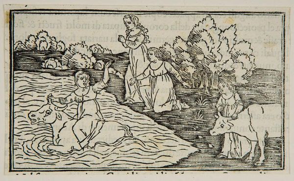 Editor: So, this is Illustration XXXVI, by an anonymous artist, residing at the Harvard Art Museums. The graphic style feels really raw and immediate. What do you see in this piece? Curator: Well, my eye is drawn to the figure's gesture, pointing towards something unseen, almost like he’s saying, "Look! There!" It makes you wonder what he's indicating. Is it salvation, destruction, or perhaps just a new pasture for that rather nonchalant-looking cow? Editor: I never considered that. I was too focused on the primitive style. Thanks; now I'm curious about where he's pointing, too! Curator: Exactly! It's a simple image that prompts profound questions.