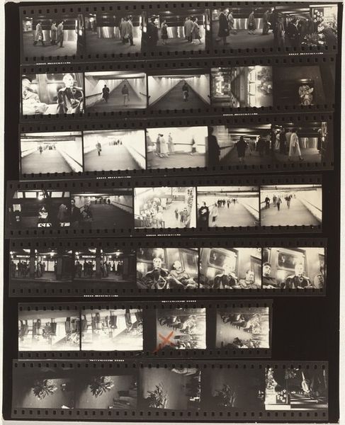 Editor: This is Robert Frank's "Guggenheim 426/Americans 76--Glendale, California" from 1955, a gelatin-silver print. It feels almost like a storyboard, a collection of mundane moments. What stands out to you about the work, particularly its social context and method of production? Curator: What interests me most is Frank’s seemingly simple process of street photography. Here's someone capturing fragments of everyday American life with a camera – a tool readily available, yet capable of documenting social realities. Consider the means of production here. He’s not in a studio; he’s on the street, encountering these scenes organically. Editor: So the actual making of the photograph, the act of walking and shooting, is the important element? Curator: Precisely. Think about it: the labor involved, the materials—the film, the printing process—and then consider what he’s documenting. This wasn't staged like much earlier documentary photography; instead, he documents casual gatherings, interactions with cars. He captures these with seemingly spontaneous arrangement and inelegant compositions, challenging conventional high-art photography which usually dictates the look of these scenes. Editor: I see what you mean. He is consuming these interactions as he shoots? It doesn't seem posed. It makes me wonder, were the people photographed at all aware? Curator: Exactly! Frank captured what he wanted, adding to the raw, found atmosphere. Do you notice any economic differences represented in the gelatin-silver print, with an eye toward how that era has been seen through rose-tinted glasses? Editor: I hadn't thought of that at all, to be honest! It seems pretty bleak after what you mention. All of the snapshots combined deliver this quiet sense of despair or melancholy, while presenting everyday normal life. Thanks for giving a unique viewpoint. Curator: Absolutely! Frank gives us just that through a rather blunt manner. Material analysis lets us consider process to find value that wasn't always there to begin with!