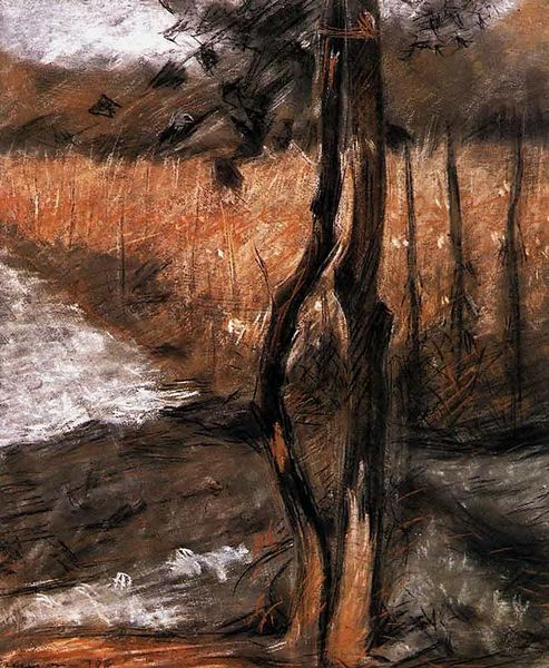 Editor: We're looking at "Grassy Riverbank," painted by Georges Seurat in 1881 using oil paint. It has such a calming effect; the brushstrokes and the earthy color palette give it a serene feel. How do you read this landscape? Curator: Its serene nature emerges from Seurat's masterful arrangement of forms. Notice how the composition relies on horizontal bands--riverbank, water, distant bank--punctuated by vertical tree trunks. How does this structure influence your viewing experience? Editor: I see what you mean; that balance definitely reinforces the feeling of tranquility. The reflections in the water also catch my eye. Curator: Precisely. Consider the interplay of light and shadow, and the way the visible brushstrokes, applied with such precision, contribute to a textured surface. The paint application itself becomes a key element of its formal design. It avoids high-contrast or stark lines, all within a reduced range of earthy and complementary colors. What feeling does that elicit? Editor: It almost feels hazy, like a memory. It's less about photographic reality, more about feeling the place. So the composition, light, and even the texture work together. Curator: Indeed. What initially strikes us as a simple landscape reveals itself as a carefully constructed arrangement of shapes, colors, and textures. The beauty lies in the relationship between the pictorial elements, not the simple mirroring of the outside world. Editor: I understand now! Focusing on those relationships makes you appreciate how meticulously he's constructed the whole. Curator: Exactly. And by extension, understanding the piece visually allows one to connect with its affective properties more deeply.