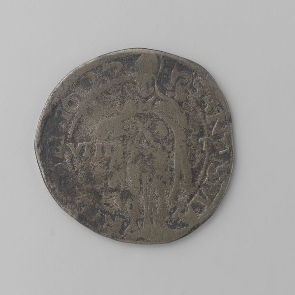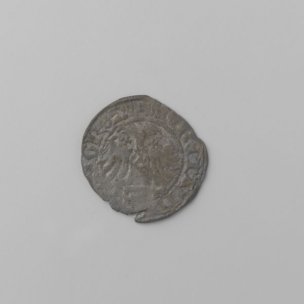 Editor: We're looking at a "Gelderse penning (denier) van graaf Otto II," a medieval coin made of metal dating back to between 1229 and 1271. The textures and shapes feel really simple and direct. How do you interpret this work from a formalist point of view? Curator: The coin, at first glance, presents a circular format, emphasizing a sense of unity. The artist works within the restrictions of space. We might examine how effectively this limited relief suggests power. Editor: Are there are formal properties you find particularly intriguing? Curator: Note the execution of line; there's an evident tension between the rigidity of geometric pattern and the somewhat free rendering of the central figures and forms, which produces visual interest despite its small scale. What of the patination—does it diminish or augment the form? Editor: That's interesting, because it's so worn, it seems like the patination sort of softens the overall texture. Do you see any meaning created from that worn surface? Curator: The worn nature certainly changes the character and contributes to its beauty. The light catches the varying planes unevenly, further articulating form and grounding our contemporary viewing. But, consider if that meaning distracts us from the object's composition as originally conceived. Does it risk overwhelming the intentionality of the Medieval artist? Editor: It is definitely something to consider. I’ve learned a lot. Looking at the work as a set of lines and patterns is new to me. Curator: As for me, your remarks encourage to think about how the work has meaning based on the current time and setting of its display.
