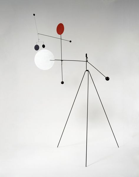 Curator: I find myself strangely captivated by this spare object—such apparent simplicity holding an almost meditative quality. Editor: It's so skeletal. Precarious even. It really lays bare its making, doesn't it? All these rods and wires supporting almost nothing. What is this, exactly? Curator: This is "Object with Red Ball," a 1931 mobile by Alexander Calder, constructed from metal and bronze. Editor: Mobile, yes, but there’s an undeniable sense of industrial materiality, of an engineer’s aesthetic. Did Calder intend for viewers to consider the labor involved? Curator: Absolutely, his construction engages the legacy of Constructivism and a focus on elemental forms. Consider how the red ball acts as a powerful visual anchor, doesn't it suggest a sense of controlled tension, a balance of forces in constant negotiation? There’s almost a primal language at work. Editor: Interesting point about tension. To me, that blood-red sphere is viscerally arresting against those austere industrial components, isn’t it about the pure physics and materiality—that stark contrast, the weighty potential for movement carefully controlled. Curator: But that careful control opens doors! The symbolic language allows for multiple interpretations—celestial bodies, abstract emotional states. Calder gives us these few, key shapes and leaves us to project our internal landscape. The line and circle become powerful carriers of meaning. Editor: I suppose…But doesn’t focusing on some symbolic meaning take away from the ingenuity, the labor-intensive and surprisingly handmade construction that brings such perfect poise? The very fact that it almost—but doesn't—fall apart! It shows Calder embracing not some ideal, but the beauty and honesty in process. Curator: Perhaps, or is that an understanding we impose today, divorced from his intentions. In Calder’s moment, did he perhaps have aspirations that the language of his sculptures should move towards transcendence and poetry. Editor: Point taken. A fusion of pragmatic making with loftier artistic ambitions! Curator: Precisely. Something elemental. Editor: It still looks pretty handmade. Almost makeshift even, but with a powerful allure that pulls us toward seeing the elemental process within something seemingly simplistic.