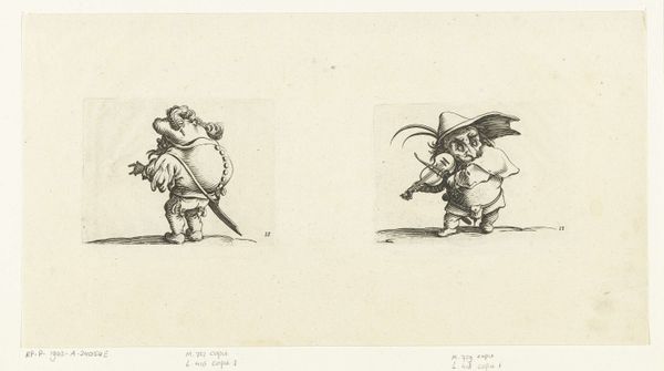 Curator: This little etching just cracks me up! What a wonderfully weird image. Editor: It certainly has a strange charm. This engraving, "Dwerg met viool en zwaard" or "Dwarf with violin and sword" comes from the hand of Isaac Walraven sometime between 1696 and 1765. Curator: A musical, diminutive figure wielding a weapon? So contradictory! He seems plucked straight from a fever dream, like a lost character from some forgotten fairy tale, balancing sweetness and a hidden threat. Editor: The contrast speaks to the anxieties around class and the social order. The exaggerated features and the sword can be seen as symbols of rebellion and perhaps the grotesque reality faced by marginalized figures seeking both recognition and power. Curator: I adore the way the light etches the tiny lines of his quirky outfit, it really amplifies his cartoonish nature. The tilted hat, the awkward stance – he’s so visually arresting. Editor: His whole posture suggests a challenge, the upturned head a challenge to assumed aristocratic hierarchies. The art reminds us that visual imagery has historically reinforced prejudiced perspectives but was also skillfully exploited to subvert social bias. Curator: Absolutely! And I’d guess it's part critique and part fantasy... the eternal struggle, isn't it? So this dwarf, maybe he symbolizes this whole baroque tension, of beauty versus ugliness. What do you reckon? Editor: That is a valuable addition. Thank you. I have reconsidered and can more deeply appreciate how you point to art’s function as a means of self discovery and self definition. Curator: Right? It just strikes a chord with me. What do you think? Editor: Well, as a powerful testament to our shared humanity, and as a way forward towards greater equality through both recognition and change. Thank you.