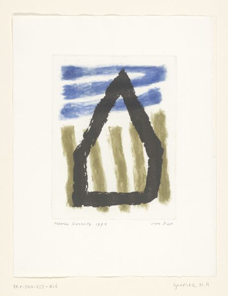 Curator: Welcome. We're standing before Harrie A. Gerritz's 1994 work, "Rode toren, halfronde blauwe cirkel"—or, "Red Tower, Semicircular Blue Circle." It's a drawing on paper, currently held here at the Rijksmuseum. What's your initial read? Editor: Stark, isn't it? The limited palette and simplified shapes lend it an almost childlike quality, yet there's a certain gravitas. The textured materiality of the paper contrasts beautifully with the flatness of the forms. Curator: Indeed. I'm interested in Gerritz’s process. Working on paper, using the medium of drawing—which traditionally is seen as less ‘important’—sets this work apart. The means of production, readily available and perhaps chosen for that very reason, speak to a wider democratic impulse. Editor: But look closer—it's about more than mere access. Notice how the blue shape doesn’t just sit within its yellow outline; the texture almost feels embedded into the fibers of the paper. How do you interpret that contrast between line and form? Curator: I think it is more relevant that the choice of these easily accessible materials, shifts the work’s interpretation away from high art towards accessibility and the everyday. It poses questions about art’s function and social context, not just aesthetics. Editor: Possibly, yet these very simplistic forms command space and attention. A lone tower contrasts against the solid weight of a half-circle, creating an intentional yet uneasy tension. Curator: And one might ask, what's the relationship between the subject, or the red tower in particular, and its title? What does Gerritz mean when he assigns 'tower' as the subject in his composition, given his conscious choice to democratize material access and process? Editor: Perhaps there is a correlation between the simplistic materials and minimalist architecture of this particular moment? Its scale could be symbolic of industry's accessibility—which can be easily consumed by a working class who also embrace an idea such as Modernism. Curator: Perhaps… both a formal examination and focus on material accessibility reveal the intricacies of this drawing, demonstrating just how such divergent interpretative avenues can actually coalesce in considering works from this period. Editor: It is indeed compelling how it brings material analysis and semiotic considerations together to create multiple layers of interpretations, prompting diverse lines of enquiry into seemingly simplistic designs.