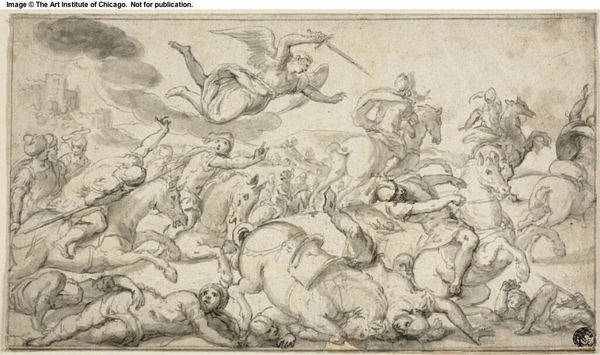 Editor: Willem Pietersz. de Leeuw's "Lion Hunt" is a whirlwind of spears and claws. It's so dynamic, almost chaotic! What exactly is going on here? Curator: Chaos is right! Think of it as a staged dance of dominance. The men on horseback, they're not just hunting lions, they're asserting control over nature, over their own fears, maybe even over death itself. Notice the fallen figure – it’s a stark reminder of the stakes. Editor: So, it's not just about the hunt, but what the hunt represents? Curator: Exactly! It's a visual poem about power, fear, and the eternal struggle. Does it make you want to grab a spear and join the fray? Or perhaps just observe from a safe distance? Editor: Definitely observe from a safe distance! I'll leave the lion wrestling to the professionals. I guess it is about power, it's about power in the hunt. Thanks!