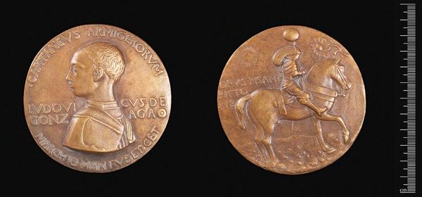 Editor: Here we see an anonymous portrait medal of Cecilia Gonzaga, likely crafted in the 15th century. It's rather small, and I'm struck by the contrast between the smooth portrait and the textured reverse. What's your perspective on this piece? Curator: I focus on the medal as a produced object. The bronze alloy, the casting process, and the inscription reveal the material conditions and social context in which it was made. How was bronze production organized? Who were the artisans involved, and what was their status? Editor: That's interesting! I hadn't thought about the actual making of it. Curator: This isn't just about artistic skill. It's about labor, materiality, and consumption in Renaissance society. Considering these aspects enriches our understanding. Editor: I see what you mean. It shifts the focus from just admiring the aesthetic to understanding the economic and social elements behind the creation. Thanks! Curator: Precisely! A valuable insight indeed.