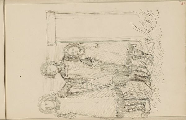Karel Frederik Bombled created this drawing, "Bedelaars," with pen in hand, now held at the Rijksmuseum. The composition strikes us first with its stark contrasts and the way figures are placed within the architectural space. Bombled plays with perspective, positioning the beggars in the foreground against a backdrop of receding buildings and distant figures. The use of line is particularly effective here. Notice how it defines not only the forms but also the textures, from the rough stones of the street to the softer clothing of the figures. The figures are arranged in a semiotic hierarchy, each element—the beggar’s posture, the child’s gaze, and the distant observers—contributing to a narrative about social stratification and the act of seeing. Bombled's subtle gradations in line weight and density create a sense of depth, while his formal arrangement invites us to consider how spaces and individuals are positioned within broader social structures. The artwork reminds us that images are not just representations but are also actively involved in shaping our understanding of the world.