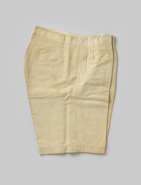 Editor: We're looking at a photograph of beige plus-four trousers made of cotton, dating from around 1925. The material looks so smooth and clean, almost sculptural. How might we approach its analysis, focusing on what’s presented? Curator: Considering the purely formal elements, one immediately notices the treatment of texture and form. The even lighting across the cotton surface allows the weave of the fabric to be subtly apparent, contributing to the volumetric shape of the trousers, don’t you agree? It seems meticulously rendered, yes? Editor: Absolutely, and I am fascinated by how this shape almost implies a human presence without actually showing one. The folds and curves make them feel worn but pristine at the same time. Curator: Note the stark background emphasizing the object's contour. How would you say it enhances the pure geometric structure, particularly how the light molds the material? Editor: It isolates them completely, directing all attention to their form. The way the leg tapers down to the fastened cuff…it's really elegant. Is there anything significant to unpack, even on such simple looking garment? Curator: The artist’s clear intention to celebrate line and shape using clothing – something utterly banal- demands a level of sophisticated reading. The photograph thus makes us aware of the very artifice of the object, divorcing it from mere function, in my assessment. The materiality of the object in itself is the theme! Editor: So it becomes about observation and interpretation rather than context, which reframes everyday garments as art. This was fascinating, seeing beyond the simple subject matter by using line, shape and shadow. Curator: Precisely, truly seeing means unraveling layers even when our initial encounter might suggest nothing much at all.