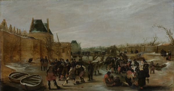 Constantinus Fidelio Coene painted "A Collision at the Porte de Hal, Brussels" with oil on canvas. The painting's composition is dominated by a chaotic scene of a market collision set against the architectural backdrop of a city gate. Coene uses a dynamic arrangement of figures and objects to create a sense of disarray. The collision's impact is expressed through scattered produce, frantic gestures, and the distorted perspective of the overturned cart. The use of light and shadow enhances the drama, with brighter areas highlighting the central commotion. The painting suggests a disruption of social order, where the planned structure of urban life clashes with the unpredictable nature of accidents. The formal elements of the painting—the contrast between architectural stability and human instability—reflect broader themes of control and chaos. It prompts viewers to consider the fragility of order in the face of unexpected events.