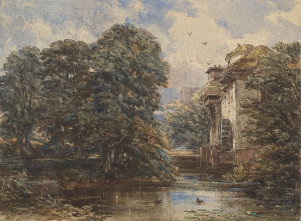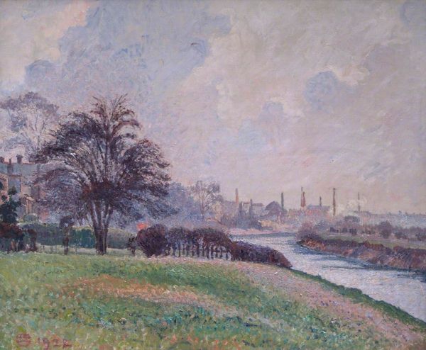 Curator: Paul Maitland, who lived from 1863 to 1909, painted this small oil on panel titled "Cheyne Walk: The Corner of Beaufort Street." It's currently part of the Tate collection. Editor: It has a rather melancholic feel, doesn't it? The hazy light and muted colors make the scene appear dreamlike and distant. Curator: Maitland belonged to a generation deeply interested in capturing urban atmosphere, and this work presents Cheyne Walk, a location near the Thames, as a space of bourgeois leisure. Editor: Seeing those lone figures on the walkway, you wonder about their stories. The scale feels isolating, especially given the grand architecture. Curator: Absolutely. The painting highlights how public space in rapidly growing cities was becoming increasingly shaped by and for the middle classes. Editor: There's a palpable sense of societal shift—a visual representation of evolving urban dynamics. Curator: Precisely. Maitland gives us a moment of reflection on the changing face of London. Editor: Indeed, it offers a poignant glimpse into a specific historical and social milieu.