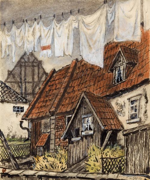This watercolor painting, "The Trefilería on Peignitz," was created by Albrecht Dürer, capturing a slice of 16th-century life in Germany. Dürer’s choice of watercolor allows for a delicate interplay of light and shadow across the built environment. The scene offers a glimpse into a bustling industrial site. The architecture itself speaks to a period where craftsmanship and functionality were intertwined. Look at the large wheel, a central mechanism of the wire-drawing mill known as a Trefilería. This would have been a hub of activity, employing skilled laborers to transform raw materials into valuable commodities. The materiality of the buildings, with their timber frames and tiled roofs, hints at the local resources available and the building traditions of the time. Notice the contrast between the carefully rendered structures and the more loosely defined landscape. Dürer’s attention to detail invites us to consider the human effort embedded in the scene, reminding us that art can be found not only in grand narratives but also in the everyday world of labor and industry.
