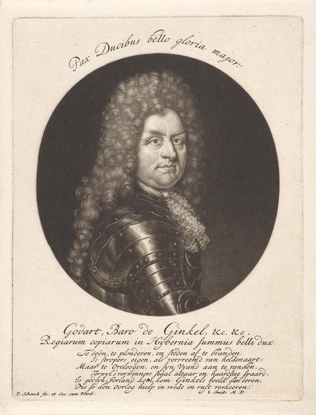 This portrait of Charles V Leopold, Duke of Lorraine, was created by Pieter Schenk around the turn of the 18th century. It is a mezzotint print, a painstaking process involving the careful roughening and smoothing of a copper plate to create subtle gradations of tone. The material itself—copper—and the techniques employed are critical to understanding this image. Mezzotint emerged in the 17th century as a way of achieving tonal richness not possible with line engraving. The meticulous labour required reflects the value placed on detailed representation and the social status of the sitter. Schenk skillfully manipulates the burr of the copper to create the illusion of textures, from the Duke's flowing wig to the glint of his armor. Each area of tone is carefully considered, demanding immense patience and expertise. Consider how the material reality of the printmaking process speaks to the labor and skill involved in the production, emphasizing the value of craft in an age of burgeoning industrialization.