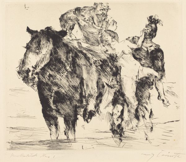 Curator: This is Christian Rohlfs' "Ochsenfuhrwerk," a watercolor he created in 1920. Editor: It's immediately striking— the frenetic energy conveyed through the almost chaotic lines. The color palette is quite earthy. A sepia-toned wash seems to unify everything. Curator: Rohlfs was deeply engaged with the Expressionist movement at this time. Expressionism arose in a period of growing unease toward modernization and embraced emotional experience over objective reality, which you can certainly see here. Editor: Indeed, the form seems deliberately distorted, which serves the painting's expressiveness so well. Look at how the oxen and wagon are reduced to these dynamic, almost abstracted shapes. The lines are not descriptive so much as they are… emotional gestures. Curator: Given the time, the artwork surely reflects the disruption in Germany, even if in an abstracted, rural subject. Remember the social disruption after the First World War—a deliberate distancing from a romanticism with a growing social critique was expressed through form and content. Editor: I appreciate that tension. There is something inherently uncomfortable in the asymmetrical placement of forms. Our eye isn't allowed to rest. Curator: Consider, too, the rise of industrialization that drove the modern aesthetic, prompting a fascination—or, perhaps, a mourning—for a rural, agrarian lifestyle. Here we see it at the edges of abstraction and near disintegration. Editor: So even with that subdued color scheme, a limited palette—we get such strong sensation! Perhaps, because each of the chosen values are relatively close on the spectrum, it has such an expressive, visual unity. Curator: "Ochsenfuhrwerk" serves as a potent reminder of art's ability to register historical and cultural shifts. It shows the shifting visual vocabulary that attempts to express it. Editor: And the power of form in distilling raw emotion, doesn't it? An evocative piece, definitely leaving its trace on my senses.