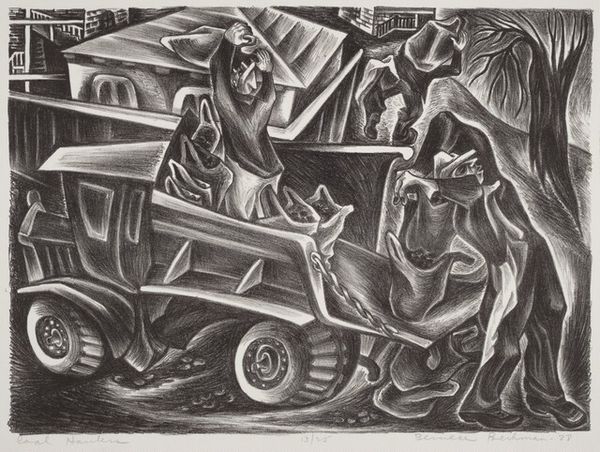 Editor: Howard Cook's print, "Fiesta," from 1933, is such a bustling piece! I'm immediately struck by the energy, everyone seems crammed together, and the tonal contrasts make it almost vibrate. It really captures the feeling of a crowded market. What do you see in this work, something beyond the literal depiction? Curator: For me, "Fiesta" speaks volumes about cultural exchange and artistic evolution. Cook's engagement with Mexican Muralism is evident, but he brings his own American sensibility to the scene. It's like he's asking us: can a celebration be both chaotic and unifying? The compressed space reflects not only the density of the market, but also the interweaving of lives and experiences. Have you considered how the absence of color influences your perception? Editor: That's interesting – without color, it feels almost timeless, even though it's clearly from a specific era. I suppose it directs your attention to form and shadow. Does that relate to his interest in Mexican Muralism? Curator: Absolutely! Notice how Cook uses light and shadow to sculpt the figures, giving them a monumental presence, a technique reminiscent of the great Mexican muralists. It also reflects on how artists were absorbing and reinterpreting cultural influences during that time. Do you think that he presents an authentic view of a Mexican festival? Editor: That's a tough question... I can't help but wonder if he idealizes the scene at all. Either way, it’s amazing how much vibrancy he can get from a simple print. Curator: I agree; and perhaps the lack of color lends the work a certain objectivity, inviting viewers to project their own ideas about "fiesta." Ultimately, "Fiesta" showcases a powerful fusion of styles. Editor: That's a great point, it made me think more critically about cultural interpretation in art. Curator: Likewise! I leave now contemplating the essence of shared experiences in art and life.