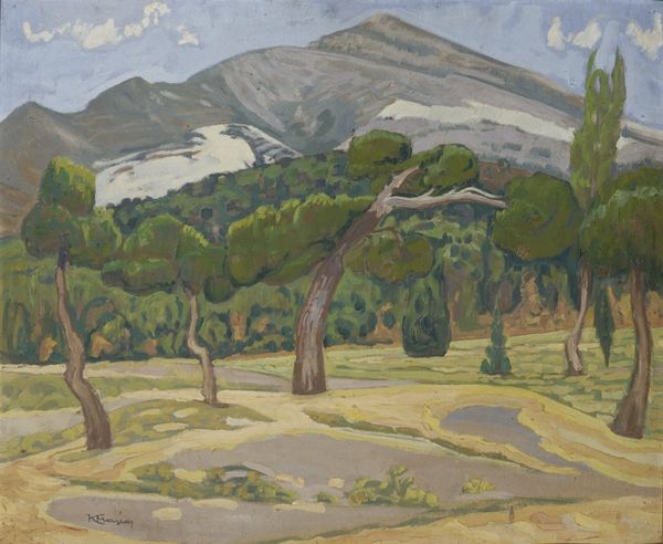 Curator: Eugene Speicher's "Landscape," now at the Harvard Art Museums, pulls you in with its hazy light. It's roughly 50 by 47 cm, a generous window onto… well, what do you see? Editor: Overwhelmingly verdant. Lush. It's a privileged view, almost obscuring the village nestled in the valley beyond. There's a sense of abundance, maybe even complacency. Curator: Speicher, working in the early 20th century, was fascinated by the interplay of light and form. Notice how the brushstrokes define volume, creating a palpable sense of depth. What materials did he employ to produce this work? Editor: We could explore this landscape as a reflection of its time. Who owned that land? Who worked it? The painting's beauty obscures those social relations. Curator: Perhaps, but the very act of representing the land—the visible labor in those brushstrokes—draws attention to its material reality. I appreciate how it asks us to contemplate the production of perception. Editor: True. It's a complex dance between aesthetics and the unseen power structures. This image and artist invite further analysis. Curator: Indeed, a landscape ripe for interpretation.