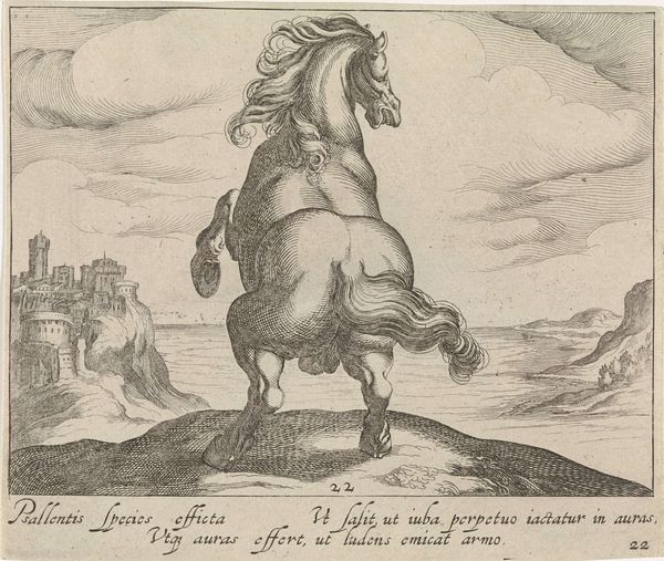 Curator: This etching, “Wild Paard” by Hendrick Goltzius, created between 1577 and 1581, immediately strikes me. The energy in the horse is palpable, even rendered through such precise lines. Editor: It's quite something. The detail, particularly in the horse's mane and the landscape behind it, is incredible. It’s at the Rijksmuseum now. As you say, I find myself so curious about the technique, but I am struggling to know more, What do you see in this piece? Curator: For me, it’s the engraving process itself that speaks volumes. Think about the labour involved in creating these lines, each etched with intent. The materiality of the copper plate, the pressure of the burin—all of these aspects contributed to the final image. Editor: I see... so, beyond just the depiction of the horse, you’re focusing on the physical act of making the artwork itself. Does that change your interpretation? Curator: Absolutely. Goltzius was not merely representing a horse; he was also showcasing his mastery over the medium. The print becomes an object of skillful labour, reflecting the values of the artist and the society he was a part of. This skilled production catered to a growing market for prints, consumed by wealthy collectors. Do you see a relationship between the horse as a status symbol and printmaking's affordability for a wider audience? Editor: I hadn’t thought about it that way, but now that you mention it, yes! The print allows wider access to that symbol of power. Curator: Exactly! It challenges traditional art history’s focus on singular, unique works. It’s not just about high art but considering how skilled artisanship and its product, the print, circulates. Editor: This makes me look at the art-making and artistry in an unexpected new way! Curator: Precisely. This new look should reveal an underlying discourse of labour and commerce, shifting away from the traditional narrative centered on aesthetics.