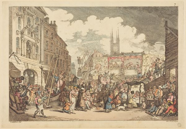 Editor: Okay, so this is "Demolition of Old Houses to the North of Westminster Abbey" created around 1800 by Thomas Rowlandson, and it’s a drawing made with ink, watercolor, graphite, and coloured pencil on paper. What strikes me is the mix of the bustling crowd and the grand, faded architecture. What story do you think Rowlandson is trying to tell here? Curator: A story etched in transience, wouldn’t you say? Look at the spindly figures – each with a narrative unfolding, colliding amidst a scene of deliberate destruction. Westminster Abbey looms, steadfast, a ghostly sentinel over this fleeting drama of urban change. Doesn't it feel like a stage set where progress and nostalgia jostle for the limelight? Editor: I see that! It feels almost satirical, the way he captures their expressions and gestures. Is he making a comment on progress or loss? Curator: Perhaps both, swirling together like the inks on the page. Rowlandson often walked a tightrope between humor and social commentary, did he not? This demolition isn't merely physical; it hints at a demolition of memories, a vanishing way of life. Though maybe he found the absurd humour in watching it happen. What’s captured in a drawing cannot vanish, you see? Editor: That's a fascinating point, the preservation through art. So, looking closer, the Abbey stands so tall in the background in comparison to all these tiny people. I suppose that this picture captured more than bricks and mortar, then. It really evokes the human cost of change, doesn't it? Curator: Indeed, what lasts is what touches the heart – whether through beauty or the sharp sting of recognition. Even in demolition there is such great artistic creation and story-telling. It all adds up. Editor: That really changes how I see the work, like he's trapped this historical moment within the art. I will never look at demolition the same way.