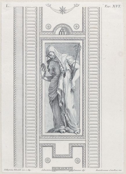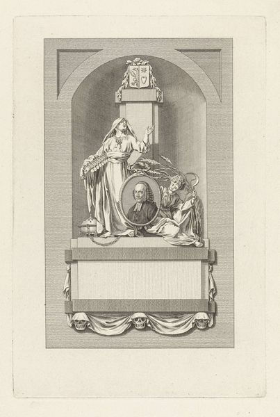 Curator: Alright, let’s spend a moment with Reinier Vinkeles' "Allegory with the coat of arms of Overijssel," made sometime between 1751 and 1816. It's an engraving held here at the Rijksmuseum. Editor: Oh, I’m immediately struck by its stillness, almost sepulchral. That stark, graphic quality gives it a certain weight. All that dense hatching, so precise! Curator: Absolutely, it's an allegory, rich with symbols referencing the province of Overijssel. You see the provincial coat of arms at the very top, sheltered by that ornate arch. Note the woman—she’s an allegorical figure, probably representing the province itself, holding what looks like a liberty pole topped with a hat. Editor: A liberty cap! Yes, a symbol of freedom... or perhaps resistance? I’m curious about the printing process; what kind of paper and inks would have been available? It has that aged parchment feeling. How many impressions were made? Was it intended for a large audience, or a select elite? Curator: Interesting questions! We do know engravings like these would have been used for disseminating information, or even propaganda. The material choices speak to the desired reach of the piece. Consider how the engraving medium itself—metal plate, laborious process—lends authority. Editor: And the cupid figure holding the shield… the child seems a bit awkward. Perhaps apprentices contributed to different parts of the plate, resulting in uneven execution. I like thinking about all the hands involved, not just Vinkeles'. Curator: It's so fascinating to remember that even within "high art," there are collaborative aspects and production hierarchies. And those tiny imperfections make it more human. They let you in. The scale of the engraving allows for an incredible density of information. A monumentality, ironically, on paper. Editor: Right, it demands close inspection. Almost like holding history itself in your hands, printed in layers and time. What began as a political gesture now provides us, centuries later, this direct, intimate relationship to that very moment. Curator: It truly is. Next, let's move over to...
