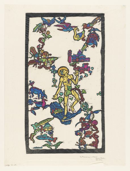Abraham Hankins created this print, "Promenade," using etching, a process where lines are incised into a metal plate with acid, and then inked and printed. The texture you see comes from the weave of the paper, which has been pressed hard against the plate during printing. The colors have been carefully considered; the juxtaposition of the cool blues and greens with warmer oranges and yellows creates a lively surface. As a print, this work is inherently reproducible. The very nature of printmaking lends itself to the distribution of images, making art more accessible and democratic. The labor-intensive process of etching, with its combination of technical skill and artistic vision, invites us to consider the value of both craft and fine art, blurring the lines between them. Looking at the image this way, we can challenge traditional hierarchies and appreciate the rich history of materials, making, and context that informs the work.