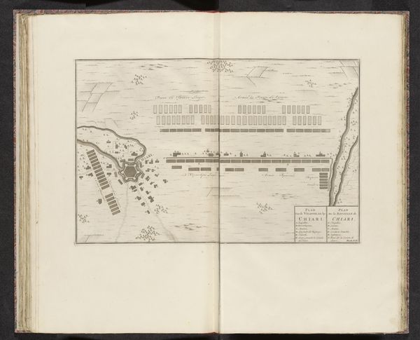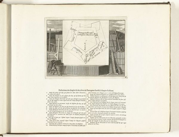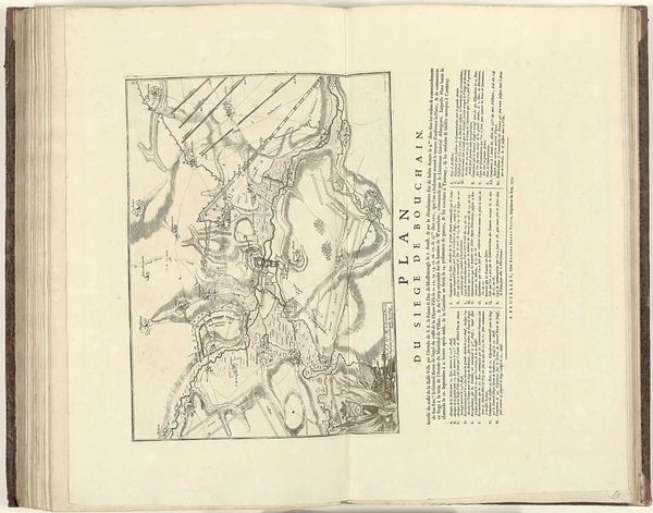 Curator: This anonymous print, dating from around 1702 and currently held at the Rijksmuseum, is titled "Plaat over loopgraven bij een bastion." Editor: My initial reaction is how intricate the lines are. The whole thing feels very controlled and measured, almost unsettlingly precise, like looking at a blueprint for war. Curator: Precisely. It's an engraving, so that sharp, clean line work is inherent to the medium. It depicts a city during what was likely a siege. Notice how the visual language normalizes and even aestheticizes the violence. We see these stark geometric shapes tracing out lines of battle and trenches, and it's all quite devoid of human presence except as represented as pawns in strategic play. Editor: So, what’s the history that informs the artist’s choices here? The piece looks objective to the events displayed within its structure. Curator: The "objectivity," if we can call it that, would certainly have served political ends. Prints such as these played a role in shaping public opinion and informing those at court of strategic and tactical developments during military engagements. We should be aware that there’s a subtle interplay between representation and reality. It offers an ideal, a design to be implemented; however, the messy realities of conflict introduce contingency and blur the neat divisions we find here. Editor: That point makes me think: is the "lack" of explicit, gruesome battle part of the point? The piece becomes propaganda due to this design as the actual war, one filled with turmoil, loss, and violence, seems far away from the clean execution represented within this piece. Curator: In line with this view of its political function, it’s important to examine the relationship of text and image. It’s interesting to observe that at least half the image plane is consumed by text in contrast to the graphic space illustrating the city at war. Here the graphic image plays an assistive role. Editor: So interesting! I think this dialogue highlighted just how crucial it is to remember that even seemingly objective depictions like this one are so enmeshed within and contribute to shaping a narrative within the period. Curator: I wholeheartedly agree. There are subtle visual cues throughout that indicate its complex ideological function in its era. This provides an excellent entry point for considering its position in society, especially given the piece's stark contrasts between form and implication.