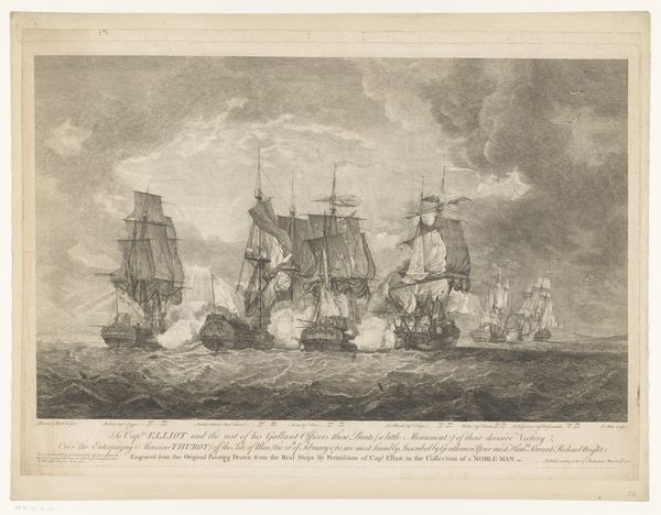 Curator: Petrus Johannes Schotel rendered this dramatic scene, "Zeeslag op de Gouwe, 1304," sometime between 1818 and 1865. It appears to be a painting, or perhaps a print utilizing watercolor. Editor: Immediately striking is its scale – it feels epic despite the soft wash of watercolor. There's an undeniable moodiness conveyed through the hazy grays and greens, and what looks like the chaos of naval warfare. Curator: The piece demonstrates a firm understanding of spatial composition. The artist's use of atmospheric perspective diminishes forms in the distance and emphasizes depth through variations in clarity. There’s also a delicate interplay of light, highlighting key narrative components. Editor: "Key narrative components" – which translates, of course, to military and colonial power being asserted through brutal naval combat. I see a romanticized depiction of violence rooted in expansionism. The painting normalizes power structures embedded in maritime history, which romanticizes war and obscures its broader impact on subjugated people. Curator: While your interpretation has merit, it would be reductive to confine our discussion merely to socio-political ramifications. Look at the careful arrangement of vessels and how the orthogonals converge. The artist utilizes repetition of vertical elements in the ship masts to lead the viewer's gaze toward a vanishing point on the horizon. It’s academically rigorous. Editor: I would argue against completely separating academic technique from its ideological implications, but that the ships in the center also draw the eye because of what looks to be an active invasion, a depiction of power and violence which is further highlighted by how small the humans look atop the vessel. It appears to portray human life as impermanent compared to the machines and forces we invent. Curator: Very astute. This examination has further revealed the formal brilliance within Schotel's watercolor. Its masterful blend of color, composition, and form showcases the depth of aesthetic possibilities. Editor: For me, this dialogue reveals the layered narratives interwoven with art history and production. We should critically examine the ethics presented and implied in "Zeeslag op de Gouwe."