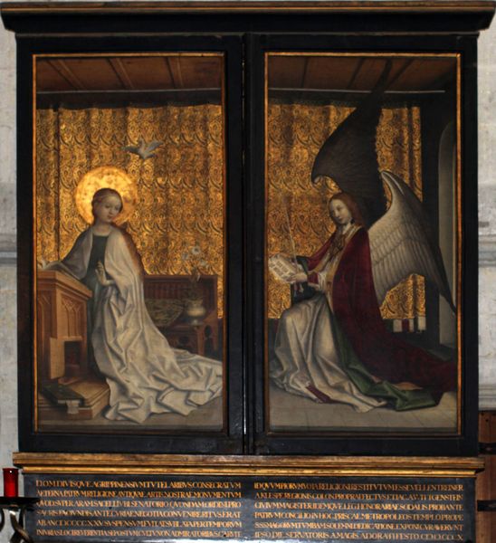 Editor: This is "The Mass of Saint Gregory," an anonymous tempera on wood painting dating back to the late 15th century. I'm struck by the painting's almost dreamlike quality, a sacred vision rendered with such meticulous detail. What symbolic weight do you see in its imagery? Curator: The power lies in the layering of symbols, certainly. Notice the chalice and wafer, central to the Eucharist, placed directly before the wounds of Christ. This echoes the idea of sacrifice and redemption, doesn't it? How do you feel about the radiant halo encircling St. Gregory? Editor: It feels like a beacon, marking him as a divinely appointed figure. Is there something to say about the other figures in this work? Curator: Precisely! Look closely at the items surrounding them; what objects are repeated, or given importance, and why might the painter include them in the scene? Think about how these visual cues trigger cultural memory, connecting the viewer to theological and historical narratives. Each object acts like a memory key, unlocking layers of meaning. Editor: So, it is about understanding these historical images and their visual vocabulary… I guess I can start decoding the other iconographic images depicted! Curator: Indeed. And understanding how that visual vocabulary shifts and transforms over time is key to unlocking deeper meanings in art. It’s not just seeing; it’s remembering. Editor: It feels like looking into a whole world of connected meanings. It makes you wonder how visual culture might transform through different eras.