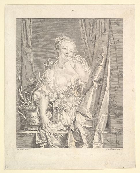 Curator: Oh, he's seen things, hasn't he? Look at that upward gaze, that wispy beard...it speaks of a soul seasoned by time, touched by a quiet, enduring faith. Editor: Indeed. We're looking at "Apostel Bartolomeüs," an engraving created sometime between 1712 and 1786 by Giovanni Marco Pitteri. The print captures the apostle's image, specifically referencing the account of his martyrdom, holding in his right hand the instrument that, in the religious literature, led to his demise. Curator: That knife… the weight of it seems almost palpable. It adds such a sharp tension to his otherwise serene expression. Does anyone else see a sort of profound sadness there, etched in the lines around his eyes? A sense of foreboding, maybe? Editor: I think we must be attentive to the colonial dimensions, in considering any religious figure from this time and artistic style. Bartholomäus, or Bartholomew, in his apostolic function of "bringing" the Gospel to far away communities participated in some of the mechanisms of oppression and the erasure of indigenous spiritualties, not to undermine his figure. Also, in terms of gender representation, there are many interpretations that should be explored in relationship to the hypermasculinized figure of the apostle as seen by baroque lenses. Curator: Right, this is interesting, you almost never imagine someone considering baroque aesthetics in these theoretical parameters, I understand what you mean, it resonates for me with the way his figure has this inherent imposition due to his inherent whiteness and dominant figure in Christian European history and society. His stare and figure demands presence without necessarily generating a fraternal sensation to me as a spectator. It also contrasts with what the literature would describe as his alleged soft traits. What would the other Apostles and Jesus felt, when seeing this man walking between them. That is precisely what a work of art like this make me wander to ask. Editor: That sense of imposing gaze makes us confront, to our days, questions about cultural and ideological authority. We need to discuss it even if these works' artistic values cannot be overlooked, or dismissed because it would be detrimental. Curator: So true. I suppose that’s the point, isn’t it? Great art provokes, stirs, and makes us look inward, even when it depicts the most outwardly pious figures. Editor: Precisely, art as an entrypoint, even if that entry opens us to questions that destabilize any alleged aesthetic of harmony or divinity.