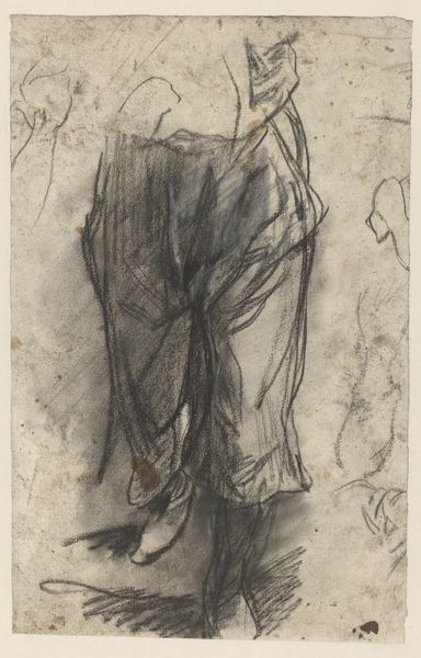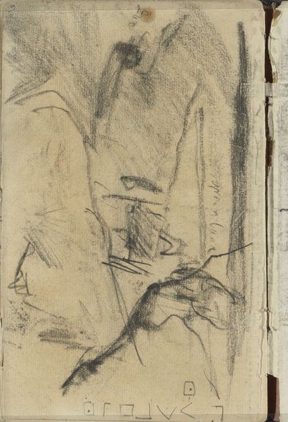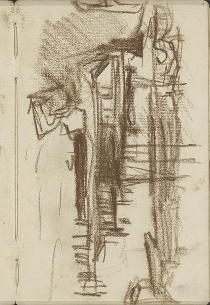 Curator: Looking at this sketch, I immediately get a feeling of wistful observation—almost like a half-remembered dream of a mundane moment. Editor: We're looking at “Young Couple with Bicycles,” a 1933 drawing by Christian Kongstad Petersen. It's held here at the SMK, the National Gallery of Denmark. The piece presents the figures predominantly through line work. Do you get a sense of the era from its composition or technique? Curator: Absolutely! It’s the clothing, the very sketchiness. It evokes that interwar period, a kind of quiet restlessness hanging in the air. I wonder about their destination, and whether they will escape what’s just around the corner: economic hardships and, ultimately, war. But they may also be just heading out to pick up the kids! Editor: It's interesting how the artist captured that sense of precarity with such sparse strokes. Note how the focus on linearity really highlights the material constraints. Cheap materials, and quick execution. Petersen needed to convey a specific narrative or sensation efficiently, a reflection perhaps of limited resources. What impact does that stylistic urgency have on the viewer, in your view? Curator: The lack of detail encourages imagination, of course. You see the bicycles and automatically infer leisure or freedom, despite their quite austere clothing. Yet it does feel hurried and incomplete, as if Petersen couldn’t afford—in terms of either time or materials—to render the image with full detail. They’re suspended, incomplete, on the page, heading somewhere unspecified in 1933. Editor: In a world increasingly fascinated by digital artistry, it's rather impactful to consider the historical reliance on humble materials like charcoal and paper to convey deeply human narratives, what do you think about it? Curator: Well, it makes you realize that it is always the person’s expression rather than how the medium constrains them, the line work may make you wonder where they will go but, as people say, "It's not about the destination but about the journey". Editor: Precisely! That interplay is fascinating and probably also reveals something unique to everyone.