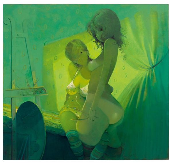 Editor: So, this is Lisa Yuskavage’s "Bedheads" from 2018, painted in oil. It’s… kind of unsettling? The whole scene has this off-kilter, green tint, and the figures seem so exposed. I can't quite decide how it makes me feel, really. What's your take? Curator: Unsettling is a good word. Yuskavage’s work often sits in this interesting space – are we titillated, uncomfortable, or strangely moved? It’s definitely the kind of bedroom scene we aren't meant to see. The heavy, almost sickly, green light—almost cinematic, wouldn't you say?— does a lot to throw us off balance. What do you notice about the composition? Editor: Well, the figures are off-center, almost cropped, like we're peeking in. And the man taking his pants off – or putting them on? – blocks a lot of the space. It makes it feel very… intimate and awkward. Curator: Precisely! It's intimate, but not necessarily romantic. The composition disrupts any sense of idyllic love. Look at the woman – reclined, yes, but is she comfortable? Her gaze seems almost confrontational, or perhaps simply disinterested. Is there any other feature that jumps out at you? Editor: The two wine glasses – that seems like it means something! Are they empty? Maybe they had a fight and aren't talking to each other? Curator: Ah, the wine! The loaded symbolism of a shared drink – or the lack thereof. A post-coital scene or maybe pre. Yuskavage enjoys leaving things deliberately ambiguous; we are the ones who create meaning from those clues and interpret what’s unfolding – or unraveling – in that green boudoir. Editor: So it’s up to us to decide if it's romance or…something else entirely? I'm still processing the green. Curator: Absolutely. She uses these artificial colors to provoke us. It's like a dream…or a nightmare. It leaves us wondering about the truth of intimate moments, how we choose to portray it – or perhaps how it actually unfolds, even for ourselves. Editor: Huh, I’ll definitely look at Yuskavage differently now! Thanks for the insights.