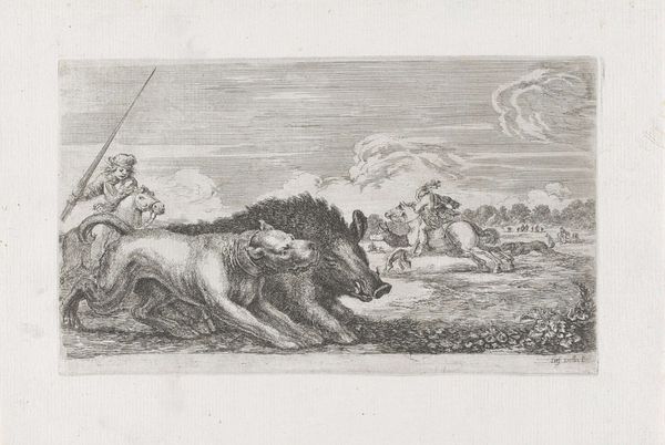 This print, "De wreedheid van de stier," was made in 1647 in the Netherlands by an anonymous artist, using etching. This intaglio process involves covering a metal plate with a waxy ground, drawing through it with a needle to expose the metal, and then submerging the plate in acid. The acid bites into the exposed lines, leaving an image that can then be inked and printed. The material qualities of the print – its crisp, dark lines and the stark contrast between ink and paper – lend a sense of immediacy and drama to this rather bizarre scene. A bull gores a man as his wife is launched into the air holding a kite, while villagers watch, and a windmill stands serenely in the background. It's worth considering the labor involved in the production of prints like this. Each one had to be made individually. This etching reflects the era’s tumultuous social and economic changes, as well as the rise of new, and often dangerous, forms of labor. The artist makes no distinction between fine art and craft, using a medium and subject matter that are both highly accessible.