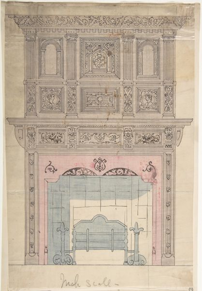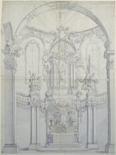 Charles Percier created this watercolor and graphite study, "Elevation of Reims Cathedral with the Royal Box for the Coronation of Louis XVIII," now at the Metropolitan Museum of Art. The drawing showcases a symmetrical elevation dominated by architectural elements and decorative ornamentation. Notice the repetition of vertical lines and arched forms, creating a rhythm that leads the eye toward the royal box, draped in luxurious blue fabric. The color palette, though muted, employs strategic golds and blues to emphasize areas of importance. Percier’s formal rendering offers insight into the symbolic encoding of power. The composition meticulously balances classical motifs with royal heraldry, reinforcing the idea of restored monarchy through visual language. Architectural rendering becomes a powerful tool, where each line, curve, and color contributes to the construction of legitimacy and cultural identity. Consider how the drawing's meticulous detail functions not merely as representation, but as a semiotic system, one where every element serves to communicate specific meanings about authority, heritage, and tradition.