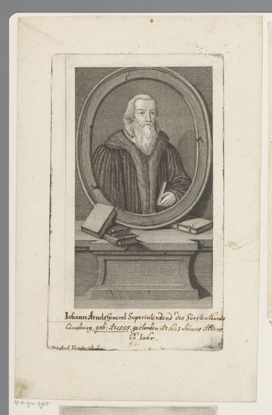 Curator: Looking at this print, created sometime between 1700 and 1749 by M. Weismüller, one immediately notices the traditional framing. It’s an engraving, a portrait of Johann Arndt, set within an oval frame and presented almost like a sculpted relief. The text below adds another layer of formality. Editor: It strikes me as both solemn and studious. The subject, Arndt, is posed mid-writing, and his gaze seems fixed on some distant thought, or perhaps a divine revelation? His clothing – the fur-lined robe and the ruff – it’s all so meticulously rendered. What can you tell us about this man? Curator: Johann Arndt was a German Lutheran theologian, a prominent figure in the development of Pietism. That probably explains the intensity you noticed. The engraving itself, typical of the Baroque period, reflects Arndt's growing posthumous fame and influence within religious circles. Prints like this were important for disseminating his image and, by extension, his ideas. Editor: I'm intrigued by his gesture. He's pointing with his left hand towards the open book while holding a quill in the other. This iconography suggests he is an interpreter, a guide. It seems the print is subtly making the case for his spiritual authority. Would you agree that that period was preoccupied with asserting authority through imagery like this? Curator: Absolutely. After the Reformation, portraits played a vital role in establishing and solidifying the status of religious leaders. Also, Weismüller likely never met Arndt. This is an interpretation of an interpretation, which makes one question its authenticity in representing Arndt. However, it succeeds wonderfully as a tool of veneration. Editor: Considering how prints were copied and circulated at that time, the print format almost elevates Arndt into an archetype – the wise teacher, divinely inspired. Its symbols aren't accidental. It presents a curated version of the man and his message, doesn't it? Curator: Precisely. The print operates as a cultural artifact reflecting the evolving perception of Arndt, the social functions of portraying and distributing a leader, and a larger commentary on the politics surrounding religious belief and image dissemination. Editor: It really illustrates how an image becomes a symbol, and that a symbol could be an incredibly powerful tool, particularly within specific communities, for reinforcing shared beliefs. Thank you, that helps clarify a lot about how that artwork and Arndt's imagery fits into the 18th century. Curator: It has been my pleasure!