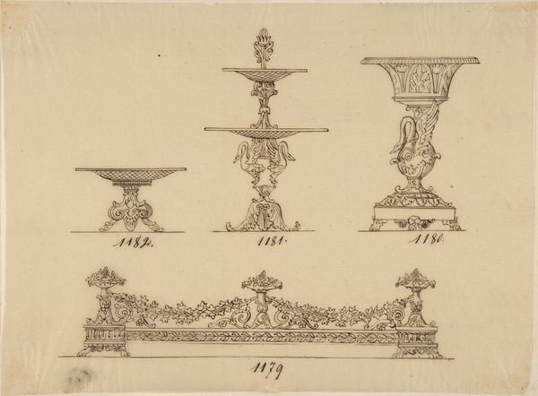 Curator: This delicate ink drawing presents us with several "Designs for Two Servers and Two Compote Dishes," from the 19th century. Editor: Immediately I notice how intricate these designs are, almost like miniature architectural renderings. The linear precision creates a rather stark, classical aesthetic. Curator: Yes, the precision speaks to the period’s fascination with Neoclassical design and a longing for the grandeur of antiquity. Serving vessels, like these, signified wealth and status in domestic settings, embodying values like hospitality and refined taste. Editor: The symmetry is also striking, though each design possesses its own unique flavor. The play of line, from the delicate filigree to the bold curves, creates visual interest even with a limited tonal range. Curator: Absolutely. Notice the use of symbolic motifs--cherubic figures evoke innocence and abundance, while the stylized foliage suggests growth and prosperity. These aren’t merely decorations; they carry deep cultural associations that elevated dining into ritual. Editor: Semiotically, the layered forms and the raised platforms inherently convey hierarchy. These aren't just containers; they're stages for food. I think that idea can be easily overlooked. Curator: They are certainly meant to convey power through visual form! Even now these servers project a fantasy of plenty; you can easily imagine them overflowing with ripe fruits, symbolizing not just sustenance but a lavish abundance for hosts and guests alike. Editor: The level of ornate detail is interesting considering that this piece, currently located at the Metropolitan Museum of Art, is simply an uncolored sketch. Curator: These designs give us an invaluable insight into 19th century material culture. We’re glimpsing into an imagination obsessed with both beauty and social significance. Editor: It's fascinating to dissect such designs—to appreciate how fundamental composition becomes the silent conveyor of societal messages and aesthetic preference. Curator: Indeed. Observing the evolution of symbols throughout time offers the same effect; these serving dishes acted as a silent heraldry, signifying power through symbolic language.