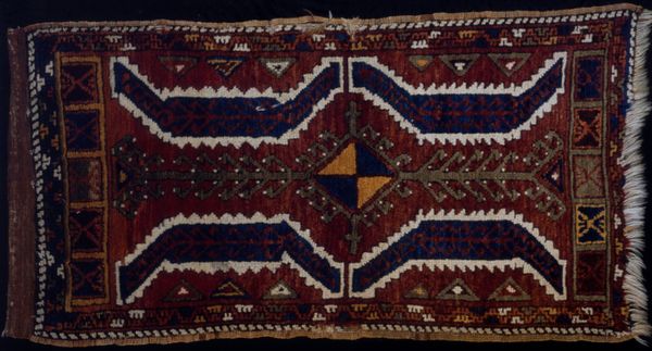 Editor: Here we have an intriguing textile work, a “Camel Bag” dating back to around the 19th century. It’s currently housed here at the Minneapolis Institute of Art. The rich colors and geometric patterns are so striking, though it does look like it has been well-used. What is your take on this piece? Curator: It's interesting to consider this "Camel Bag" not just as an object, but as a carrier of cultural and economic significance. It speaks to the nomadic life and trade routes that shaped societies. Can you see the cultural context embedded in the repeated geometric patterns? Editor: Yes, definitely! I'm picking up a visual connection to other Islamic art I've studied. Is this sort of geometric style particular to a certain region, or perhaps a group of people who used camels in their daily lives? Curator: That’s an insightful connection. Geometric patterns, prominent in Islamic art, often signify deeper philosophical concepts such as the infinite nature of God. As for this particular style, it may connect with specific tribal or regional traditions. How do you think the functionality of the bag shaped its design? Editor: Well, I imagine it needed to be sturdy and relatively lightweight. Perhaps the dyes used were locally sourced, impacting the colour palette? It must have been crucial for travel and trade. I am curious about what the politics of trade and craftsmanship were for this artist/maker. Curator: Precisely! We must also reflect on the contemporary market reception of such historical craft, as it navigates commodification in museum settings. And now knowing it was made for the utilitarian task of being put on a camel's back makes me ponder more about its social standing in that world versus today's context within the Institute of Arts. Editor: I hadn't even considered the museum’s role in assigning value to the Camel Bag. I was so absorbed in its pattern and materiality! Curator: Context transforms everything. Keep asking those questions!
