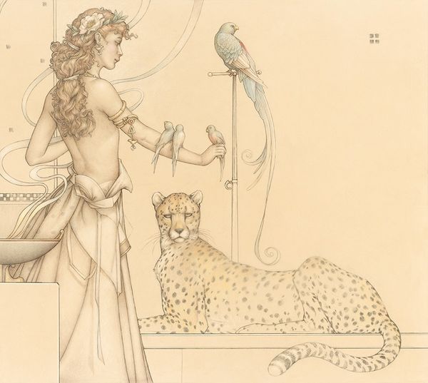 Editor: "Traveling Circus, 2011" by Michael Parkes appears to be rendered with pencil and colored pencil. It depicts figures and animals with an otherworldly, dreamy quality. There's something serene and ethereal about it that intrigues me. How do you interpret this work? Curator: Well, at first glance, the symbolism resonates deeply. The figures perched upon the rhinoceros and surrounded by lions – it evokes a sense of control over primal forces. The circus is a traditional metaphor for spectacle. It could also mean a group travelling to explore various facets of life. Do you think the women in the drawing remind you of mythological figures, maybe muses or goddesses, taming and guiding these powerful beasts? Editor: That’s interesting, I hadn't considered the mythological aspect, but I do see it. They seem so calm, almost passively in charge. The rhino and lions usually symbolize strength, right? Curator: Exactly. Strength, and untamed energy. And that they are being lead could indicate the ability of art and beauty, represented by the women, to soften even the most primal instincts. What do you make of the owl-like creature resting on the rhino’s head? Editor: I suppose it is like the other animals depicted in the piece. Is the Owl like the others animals here? Curator: In Western traditions, the Owl has represented knowledge, but is also a symbol of death and destruction, sometimes. Here, that the woman with the ginger hair isn't startled that a lion cub is perched above her head is interesting. I believe this composition invites each of us to find our personal symbology from a wide cultural selection of symbols. It is as if they are familiar parts of one's soul, not frightening images. Editor: That makes me think about how artists like Parkes use familiar images, but recombine them, creating new associations. Thanks. Curator: Absolutely! Thinking about cultural memory helps to bring new light on art interpretation.