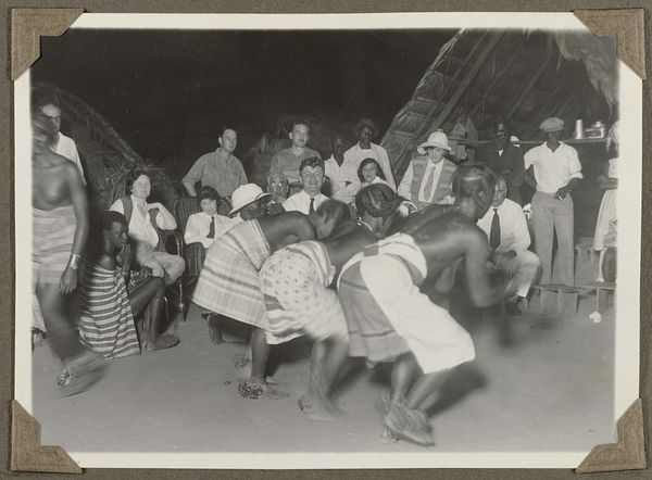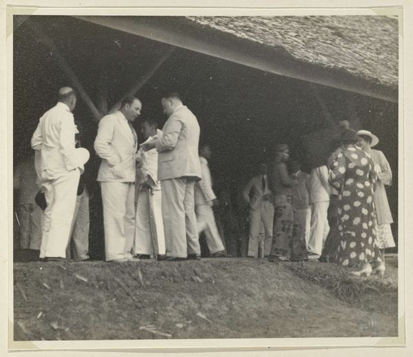 Curator: This is a gelatin silver print titled "Groep Nederlanders op bezoek in een dorp van Marrons," which roughly translates to "Group of Dutch People Visiting a Maroon Village." It dates from 1925-1927. The photograph depicts a gathering in what appears to be a village setting. What strikes you first about it? Editor: The composition immediately evokes a sense of cultural tension and a stark power dynamic. The muted color palette enhances the solemnity. It feels…staged. Curator: The image presents an encounter between Dutch visitors and the Maroon community, descendants of formerly enslaved Africans who established independent settlements. Viewing through the lens of postcolonial theory allows us to unpack the themes of cultural exchange, representation, and perhaps exploitation inherent in such encounters. How do we reconcile historical preservation with potentially fraught visual narratives? Editor: Precisely! My eye is drawn to the contrast in dress. The Maroons, some scantily clad, are positioned around the formally dressed Dutch, highlighting an assumed authority. The thatch-roofed structure becomes an emblem – perhaps it symbolizes home, but it's also backdrop to this display. I also wonder what cultural scripts are operating: Who is looking where? How are these interactions remembered or re-imagined across generations through this singular document? Curator: That's a potent reading. What might be missed in the purely aesthetic appreciation is a crucial investigation into the subjects' agency—or lack thereof—within the photograph's creation and context. I think about intersectionality in visual culture, particularly considering the Maroon community. We also have to understand this image comes from a place and time when "photography" was wielded like a sword, both as anthropological document and means to wield, exploit, and justify unequal power dynamics. Editor: Absolutely. Consider also the cultural meanings embedded in seemingly simple things – the textiles, the postures. Each communicates, whether consciously or unconsciously, facets of identity and resistance. And that house could signify so many concepts – escape, autonomy, etc. – each carrying weight and adding layers of potential narratives. Curator: Examining such a historical artifact forces critical engagement. How do we responsibly present historical records acknowledging both their value and problematic origins? Editor: Perhaps by fostering precisely the type of nuanced, challenging conversation we’re having right now. The image persists, and our imperative is to facilitate its ethical interpretation, moving beyond the visual and embracing the vast narrative context.