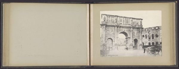 Editor: Here we have "Gezicht op de bijdrage van Ierland met een replica van het Donegal Castle op de World's Columbian Exposition in Chicago in 1893", taken in 1893 by Charles Dudley Arnold. The albumen print captures what seems like a bustling scene, and I am intrigued by the castle replica! What do you make of this composition? Curator: This photograph offers a fascinating interplay between form and representation. Note how the composition is structured around a clear foreground, middle ground, and background, creating depth and a sense of spatial recession. The Donegal Castle replica serves as the central focal point, its solid form contrasting with the softer textures of the surrounding foliage and the hazy sky. Consider also the strategic placement of figures within the frame. They animate the scene while drawing our eyes across the picture plane. How does the light seem to strike the image? Editor: I see how the figures are like points along a path, leading us back into the scene. The light seems rather uniform, doesn't it? Diffuse, not casting strong shadows. Curator: Precisely. The lack of strong contrast contributes to a flattened pictorial space, which in turn emphasizes the surface qualities of the print itself. This pushes back on any true illusion. The tonality guides our awareness. Editor: That makes me look at it differently. It is less about depth than it is about texture, even, across a two-dimensional plane. Curator: Indeed. The balance of light and shadow, the arrangement of forms, and the surface texture work in harmony to create a self-contained visual experience. The subject becomes almost secondary to how the formal devices work in relationship to one another. What do you make of that contrast now? Editor: So, it's not just about *what* is depicted, but *how* it's depicted, and the visual impact the composition creates? I never thought about it quite that way before. Curator: Exactly. By focusing on the formal elements, we can unlock a deeper appreciation for the artistry and intentionality behind this albumen print. Editor: Well, I've definitely learned something new today. Thank you.