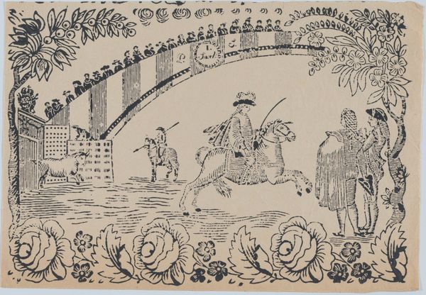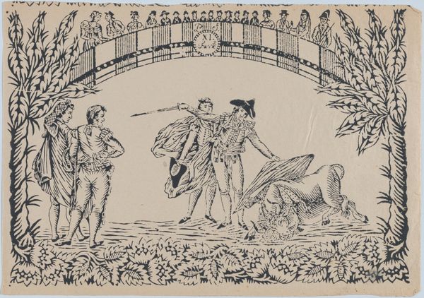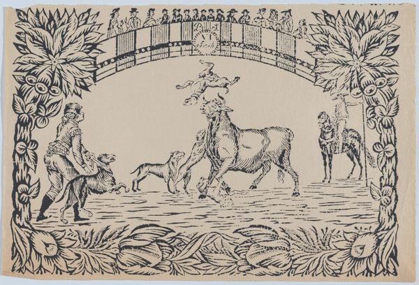Curator: This intriguing print, entitled "Suerte III: Picador stabbing a bull; two toreros running to right," is believed to be created sometime between 1845 and 1855 by an anonymous artist. Editor: Well, my gut reaction? It feels a little theatrical, almost dreamlike. The scene of the bullfight, yes, but it’s all framed by what looks like garden ornamentation. The crowd is separated by a wall, as though they are removed from the violence... or part of a different drama altogether. Curator: Absolutely, it's rife with symbolic layering. We've got this traditional bullfighting scene, a dance of death in its rawest form. Then there's the visual architecture that surrounds it. The floral designs give a classical stage-like structure. The onlookers perched above further create the spectacle; as if it were designed specifically for the rich to view. It gives the whole artwork a stylized violence, made palatable through decor. Editor: That ornate framing seems deliberate. Bullfighting, on one level, is about ritualized death and machismo. The way the artwork places an emphasis on class is difficult to ignore. The elite observe, but never engage. Curator: Exactly. And think about the cultural memory tied to bulls in art. Bulls have been potent symbols in myth and religion for millennia, symbolizing virility, power, and even sacrifice. I mean, look at its musculature rendered here. The power oozes through. But it’s power being controlled, being symbolically conquered, not for its own benefit. This form of cruelty almost becomes another visual commodity in that lens. Editor: I like how it feels simultaneously ancient and current, in the sense of spectacle and detachment. This unknown artist packed so much symbolic tension into this piece through its cultural commentary. Curator: It certainly lingers in the mind long after you've viewed it, leaving you wondering who these figures are that frame our spectacle.