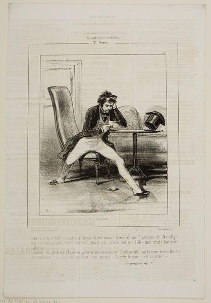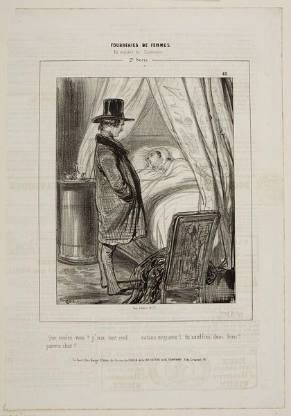 Curator: Ah, this is Paul Gavarni's "Don't you know, Mr. Coquardeau, what your daughter did?" currently residing at the Harvard Art Museums. Editor: Goodness, it feels like a scene ripped from a gothic novel—a child collapsed, a distraught father, and a figure lurking in the shadows. Curator: Gavarni excelled at capturing social critique through imagery. Here, he portrays the dynamics of family, likely commenting on the pressures and secrets within bourgeois households. Editor: The fallen toys, the limp doll... there's a sense of playfulness disrupted, almost a staged melodrama. It certainly makes you wonder, doesn't it? Curator: Indeed. Gavarni's work often served as a mirror reflecting the anxieties and moral ambiguities of 19th-century Parisian society. Editor: Makes you wonder what secrets families hold, doesn’t it? What price innocence in a world that doesn't value it?