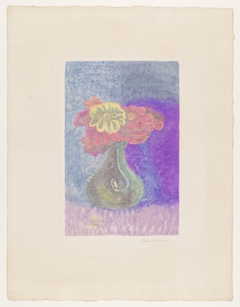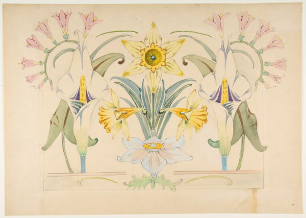 Curator: Let’s discuss this striking print, "Woman Receiving a Vision in a Garden," created around 1897 by Georges de Feure, housed right here at the Rijksmuseum. It combines linocut and watercolor. What are your first thoughts? Editor: Dreamlike, almost unsettling. The pastel colors and stylized forms give it an ethereal quality, but there's something about the woman’s isolation and the almost monstrous-looking flora that feels ominous. Curator: Indeed, it’s a superb example of symbolism and Art Nouveau aesthetics mingling. De Feure operated within a late 19th-century context where artists sought to express inner psychological states and challenge academic artistic traditions. The work was born of a historical revolt against realism. Editor: Absolutely, the focus on inner experience is evident. It is the tension between the woman's vulnerability, her possible vision and the rather dominating presence of those large, maybe poisonous plants that I find really captivating from a feminist lens. The woman appears passively receiving; it raises questions about agency, the male gaze, and female representation. Is this a liberation, a dream of possibilities or a cage? Curator: I see that point. De Feure designed for upper middle class patrons, he captured their sensibilities, anxieties and their understanding of women at the time. Editor: These tensions surely are relevant still today: are women subjects in their own experiences or decorative objects? Does accessing vision imply control or submission? These readings show us we must resist simplifying women in art to fixed interpretations. Curator: These open narratives around femininity, dreams, and natural forms offered avenues for people to contemplate and engage. The print as a medium democratized art, making these radical styles accessible beyond the elite. Editor: True, the print medium itself enabled dissemination, extending those avenues for interpretation and meaning making around emerging cultural topics and gendered social roles beyond just wealthy buyers. Curator: I appreciate how you've drawn out those deeper social implications tied up in de Feure's alluring aesthetic. Editor: And I see how your contextualizing reveals this piece not just as a beautiful image, but as an emblem of the complex era that bore it.