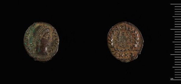 Editor: This is a Memorial Coin of Claudius II Gothicus. I am drawn to its small size, and the way time has worn down the details. How do you analyze its visual components? Curator: Note how the circular form, emphasized by the inscription, frames the Emperor's profile. The composition invites us to consider the relationship between power and representation. Editor: Can you say more? Curator: Yes, the patina obscures detail, yet the idealized form persists, asserting authority. What is the effect of that tension? Editor: I see it now; the contrast between decay and the enduring image of power creates a powerful statement. Curator: Precisely. By observing material transformation and artistic representation, we can appreciate the coin's impact.
