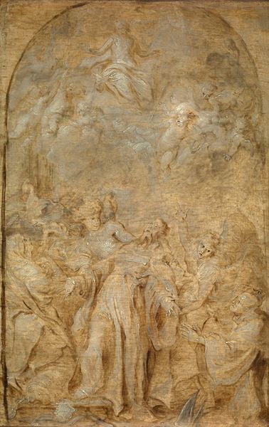 Editor: This is "Theseus Recovering the Armor of Aegeus," a drawing from around 1780 by François Valentin, housed right here at the Minneapolis Institute of Art. It’s a striking terracotta color and looks almost like it's aged on purpose. It seems to be a really intense moment. What do you see in this piece, as someone so versed in iconography? Curator: It’s fascinating how Valentin taps into the enduring power of the Theseus myth. Observe the central obelisk, a direct visual descendant of ancient Egyptian obelisks—symbols of stability, power, and the sun god Ra. How do you think that translates into this specific narrative moment? Editor: Well, considering Theseus is finding his father's armor… perhaps the obelisk is a symbol of Aegeus's authority and legacy, which Theseus is now stepping into? Curator: Precisely. It’s more than just armor; it's a mantle of leadership, a cultural inheritance. Look at how the figures interact: the forward-pointing child, a gesture toward the future; the mother, a protective, guiding figure. What feelings or concepts do those visual relationships suggest? Editor: Hmmm, maybe that he’s not just becoming a leader but also starting a family legacy too? He’s recovering his armor and also stepping into a future as a leader, husband, and father? Curator: Exactly! Notice also the strategic use of color: that monochromatic red chalk evokes classical sculpture, grounding the scene in antiquity, connecting to a cultural memory of heroes and legends. Do you think this drawing feels like a finished artwork? Editor: Not really. It almost feels like a sketch, yet the narrative is complete, powerful, ready to be scaled into a monumental artwork. Thank you, this was incredibly insightful! Curator: My pleasure! Exploring these connections illuminates how images across time, how simple shapes and figures contain narratives we understand on a primal level.