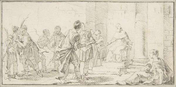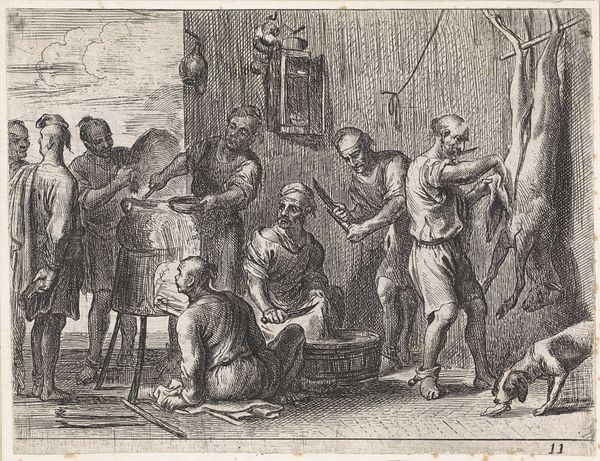 This print, made by an anonymous artist, is a copperplate engraving, a process that involves incising lines into a metal plate, inking it, and then pressing it onto paper. The engraver’s skill lies in their ability to translate tones into lines, creating depth and texture. Look closely, and you'll see how the density and direction of these lines define the forms, from the folds of the clothing to the leaves of the trees. Each mark is a result of labor, a testament to the time and effort required to produce such a detailed image. Consider the social context: prints like these were relatively affordable, making art accessible to a wider audience. This allowed for the circulation of moral tales, like that of the prodigal son, connecting viewers through shared narratives. The making of the print itself reflects a shift in how art was produced and consumed, moving away from unique, handcrafted objects towards more reproducible forms. By focusing on the material and process, we gain insight into the cultural values embedded within the artwork, challenging any separation of craft and fine art.