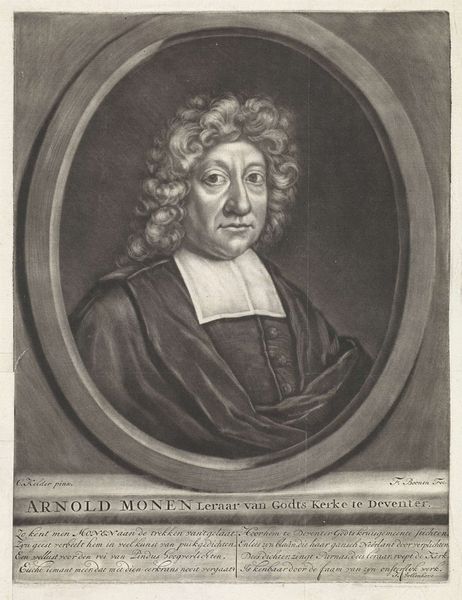 Curator: Here we have Pieter Schenk’s *Portret van Jacobus Streso*, an engraving dating sometime between 1670 and 1713. It’s currently held in the Rijksmuseum. Editor: It immediately strikes me as somewhat austere. The oval framing, combined with the subject's serious expression and dark coat, creates a very formal and contained image. Curator: Indeed. The Baroque elements are undeniable, notably in the subject’s elaborate wig. Let's consider Schenk's process, creating this image through engraving; can you imagine the precision and skill required to render such intricate details with burin and ink? Editor: Absolutely. It’s important to note that prints such as this had very practical applications. They were multiples, produced and disseminated widely, making them tools of promotion and vehicles for commerce. How fascinating to see labor replicated so artfully. Curator: I agree that the mechanics of its production are important. But focusing solely on replication ignores the masterful use of line and shadow. Look how Schenk uses hatching and cross-hatching to create a sense of depth and volume. The contrast is so delicate! It suggests a psychological depth as well. Editor: I concede that Schenk’s handling of light and shadow is sophisticated. However, the purpose-built nature of such works cannot be overlooked. These portraits were often commissioned, tools for forging relationships, or elevating status through broad distribution. Jacobus Streso likely wished to solidify his public image, and this piece was integral to that process. Curator: Perhaps so. Yet, focusing solely on its functional aspect discounts the artistic skill involved in creating a composition that resonates even centuries later. Look at the balanced arrangement of the figure within the oval, the way his gaze engages the viewer. This is about form, too. Editor: Certainly, there is an aesthetic achievement. And to your point, despite the constraints, Schenk has indeed produced an arresting image. Its endurance speaks to both its artistic merit and its effective execution as a reproduced image in Dutch society. Curator: Agreed. By observing this artwork's structural choices, while understanding its modes of production, it brings forth multiple meanings. Editor: A richer context certainly allows a fuller consideration. Let's leave it there for our audience.