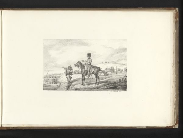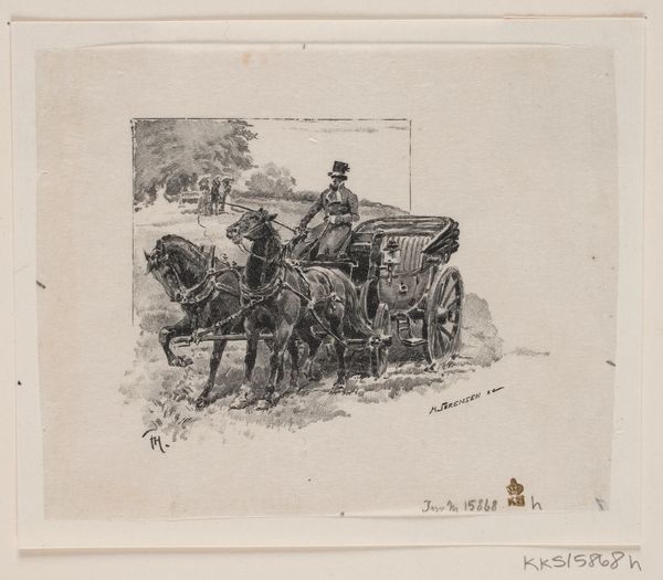 Curator: This artwork is entitled "Chariot Race (?)," an etching of unknown date by François Jules Collignon, found within the collections of the Harvard Art Museums. Editor: It has this playful, almost satirical air about it. The chaotic energy of the donkey pulling that cart is beautifully captured. Curator: The rough, etched lines really emphasize the donkey's strained musculature, drawing attention to its labor, doesn't it? The artist really makes us think about the physical process of pulling that cart and the people within. Editor: And that whip! It's not just about forcing movement, but perhaps domination, the societal power structures are represented here. The symbols are everywhere if you start looking. Curator: Indeed. I find myself contemplating how the economics of printmaking democratized art, making such satirical pieces accessible to a wider audience. Editor: Seeing the image with that context makes it even more meaningful. Curator: Absolutely. It's a small piece, but it raises big questions about how art reflects the societies that produce it. Editor: Agreed. It leaves you with a lot to ponder about cultural memory, even in its humor.