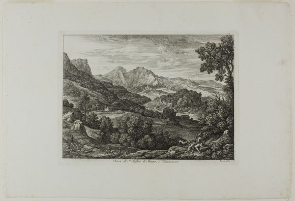 Editor: This is George Loring Brown's "View near Rome," though it's undated. It's a small etching. I'm struck by how the scene, with the ruins in the distance, feels both romantic and a little melancholy. What symbols jump out at you in this print? Curator: The ruins, of course, speak to a grand past, a cultural memory of the Roman Empire, even in its decline. But consider the trees framing the view. Twisted and resilient, they also represent endurance, and a kind of continuity, wouldn't you agree? Editor: I see that, like a natural echo of the buildings. So, it's not just about what's lost, but what persists? Curator: Precisely. And that figure resting in the foreground – perhaps a shepherd or traveler – seems to contemplate this very tension between past glory and present reality. It invites us to do the same, doesn't it? Editor: That's a deeper perspective than I initially grasped. I'll definitely be thinking about the figure differently now. Curator: Visual symbols are like that; they only yield their depth with time and reflection.