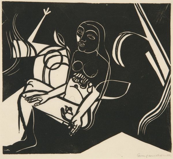 Heinrich Campendonk made this woodcut, Leda and the Swan, using stark black and white to carve out a space of both violence and tenderness. The process feels immediate, like a snapshot. There’s no room for error in this method: each cut is a commitment. The texture here is all about the contrast between the smooth, untouched paper and the rough, gouged-out areas of black ink. The dark parts aren't just flat; they have a physical presence, a kind of stubbornness. Look at the lower left of the image. Notice the way the A shape is formed by thick lines, and the strange, almost cartoonish, shapes and foliage that surround it. It reminds me of the work of Max Beckmann, who also used woodcuts to express complex ideas with striking simplicity. Ultimately, this piece is a reminder that art doesn't need to be slick or polished to be powerful. It’s a record of a physical act, a conversation between the artist and the material, full of happy accidents and unexpected revelations.